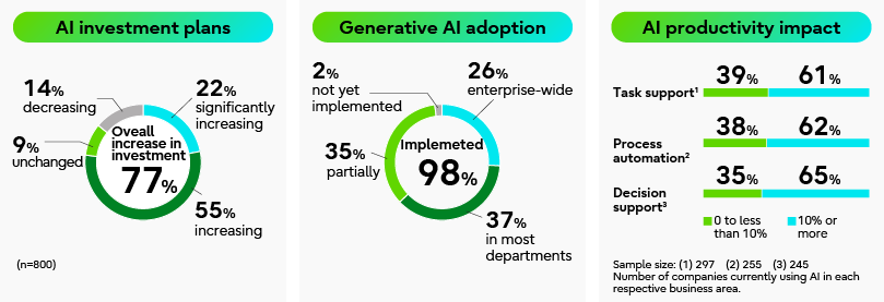 So, how well are companies adopting AI, and are they getting the desired results? According to the Fujitsu Technology and Service Vision 2025(*1)survey, conducted in February 2025 across 15 countries with 800 senior executives, nearly 80% of companies said they plan to increase AI investment this year. Furthermore, when asked about generative AI adoption, the combined percentage of companies responding “enterprise-wide,” “in most departments,” or “partially” reached 98%. Over 60% of companies using AI reported that employee productivity improved by more than 10% (see Figure 2).
