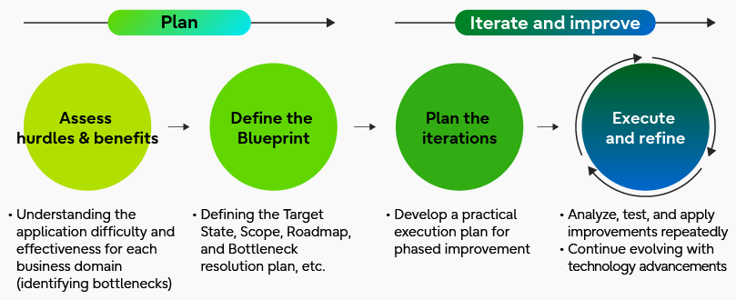 Iterative improvement means creating an iteration plan based on a roadmap. Small but specific improvement cycles need to be consistently executed. Since AI and related technologies evolve rapidly, organizations must maintain a flexible approach, continuously replacing or improving systems and processes in line with the latest trends. Rather than attempting to a sudden sea change, it’s better to progress step by step, validating results along the way. This approach reduces risk while steadily moving toward the target architecture.