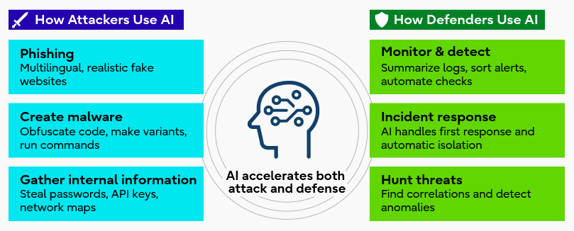 In a world where attackers routinely use AI, defenders must also fight back with AI (see Figure 5). Malicious AI-driven attacks such as phishing, malware creation and manipulation, and internal data harvesting, are becoming broader, more precise, and more sophisticated. Once inside, AI can instantly search millions of files and locate passwords with ease.